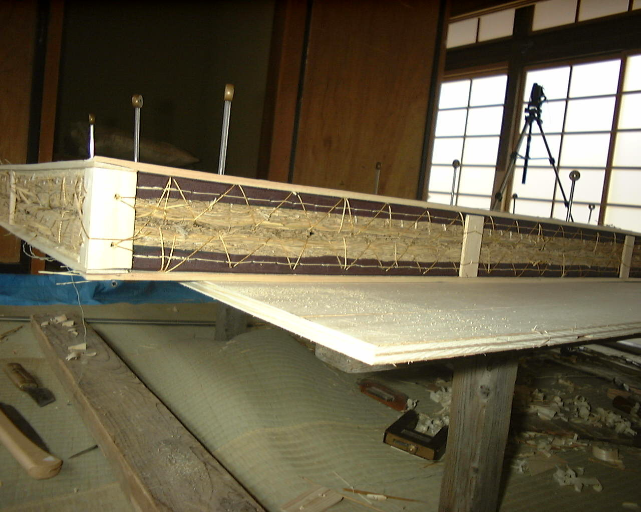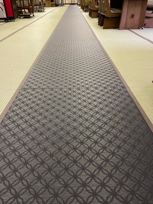 配膳にキャスターワゴンを使われていて、畳は建材床+樹脂表の組み合わせを敷かれています。配膳時、キャスターワゴンは最大で数十kgになりますのでキャスターが畳に食い込んで、樹脂表がよじれてしまい傷んでしまいますし、キャスター動作が重くなって女性スタッフさんにとっては、かなりの重労働だろうと想像が出来ます。一心館様からご相談をいただきまして、椅子テーブルとキャスターワゴンと言う使い勝手に於いては逆に畳床は硬くした方がベストとの判断から【頑畳PLUS+かちかちっ床】ご提案(適材適所)させていただき、ご採用していただいています。また頑畳PLUS(PVCシート)は圧倒的頑丈だけではなく、衛生管理面においてもとても優れています。後日スタッフさんに使用感をお聴きしましたところ、『滑るようにキャスターワゴンが動いてくれて配膳がとっても楽になりました!』との嬉しい使用感を聴く事が出来ました。かちかちっ床の構造につきましては、お打合せの場で詳しくご説明させていただきます。