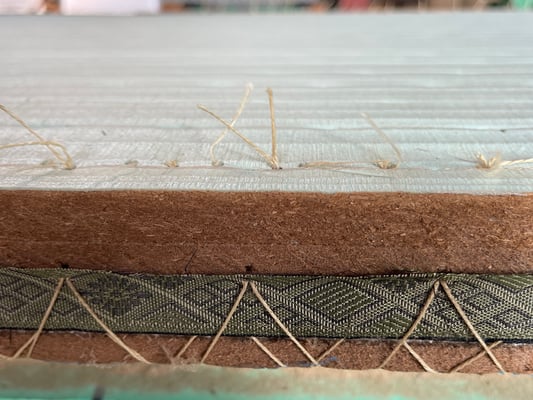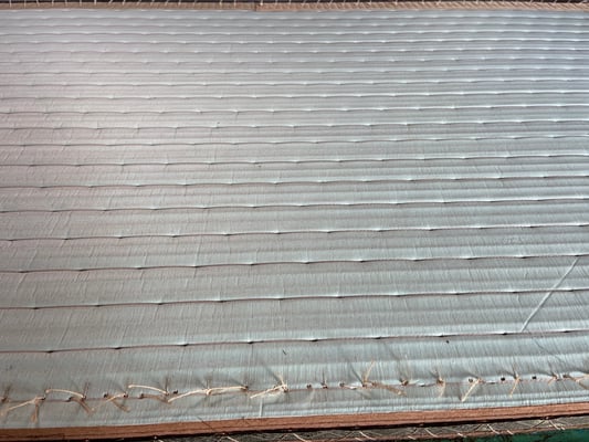お若い世代の方々はご存じないのではと思います。畳(畳の芯材)は本来、柔らかいものだったんですね。稲藁を薦に編んで重ねて縫って足で締めて...。来客の時以外は座布団は必要ないほどでした。私がそうでしたが、座敷でしょっちゅう相撲やプロレスで遊んで育ちました。でも徐々に稲藁の確保が難しくなったこと等から、稲藁の代わりになる木質ボード系材料で畳床が作られるようになりました。また藁床製床機が量産型になったことも畳床が硬くなって行った背景にあり、現在は木質ボードや発泡断熱材との組み合わせが畳床のスタンダードになっています。それぞれにシッカリした材料ですが、いかんせん硬い。その硬さを軽減しようとすれば、畳床の表面に2mm程度のクッションシートを縫い付けるしか方法がありません。新しい時は微かに柔らかさを感じますが、時間が経って行くとヘタってしまいやがて硬い畳になってしまいがちです。木質ボード系畳床に切り替わり始めた頃、お客様から背中が痛い、足が痛いなどとよく言われた記憶があります。畳のお部屋の使い道によっては硬い畳の方が使い勝手が良い場面はあるでしょうし、ここはふわっとした畳を敷きたいと言う場面もあるのではないでしょうか。食べ物に置き換えれば例えば麺類。硬めを好む方もいらっしゃいますし、柔らかめを好む方もいらっしゃいます。ですから【ふわふわっ床】は柔らかい畳を求められるお客様への、これまで無かった選択肢の一つなのです。その構造につきましては、お打合せの際にご説明させていただいております。また構造の特性から足音の軽減も期待出来ます。【ふわふわっ床】は床の厚み(20mm~60mm)全体が程よいクッションですので膝をついたとき、転んでしまったときに、厚み全体で衝撃を吸収してくれます。そこが市販されていますジョイントマットやクッションフロア等と大きく異なる性能なんですね。ですから赤ちゃんやお子さんお孫さんも、思いっきり遊べる空間になりますし、おじいちゃん・おばあちゃんも安心感のある暮らしが叶うのではと考えています(※ふわふわっ床には一部介護保険リフォーム適用になる床がございます。ケアマネージャー様にご相談されてみたください)。当店は現代の材料を用いて畳本来の踏み床のふわふわな畳床をお求めやすい価格で、お客様が選択出来る様に取り揃えております。『ふわふわっ床』も適材適所の一環です。畳の厚みは20mm~60mmの範囲で対応出来ます。『ふわふわっ床』も同様に実際に踏んで座っていただくことが正しく理解していただける材料です。当店では体感ルームを設置しております(要予約/🅿️完備)ので、いつでもお気軽にご連絡ください。忘れていた快適で充実した幸せな暮らし…のヒントに、出会えるやもしれません。