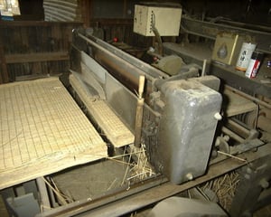 300〜400ミリほどの厚みに仕掛けられた配を、厚さ50ミリ〜55ミリに一気に圧縮、動力で押し出しながら縫い上げて行きます。。