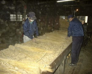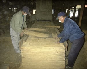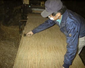 稲藁を縦に配します。畳床のコシを左右する重要な仕掛けです。太く硬い稲藁を選びます。。